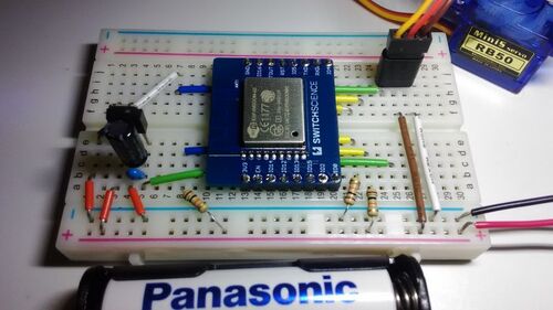 連休中に挑戦してみてやっと出来ました。 1.準備するもの ↓に書いてあるもの サーボモータ(MiniS RB50-JRを買いました→http://www.sengoku.co.jp/mod/sgk_cart/detail.php?code=2A4A-JAJP) 電池ケースと単3電池4本 低損失三端子レギュレーター 3.3…